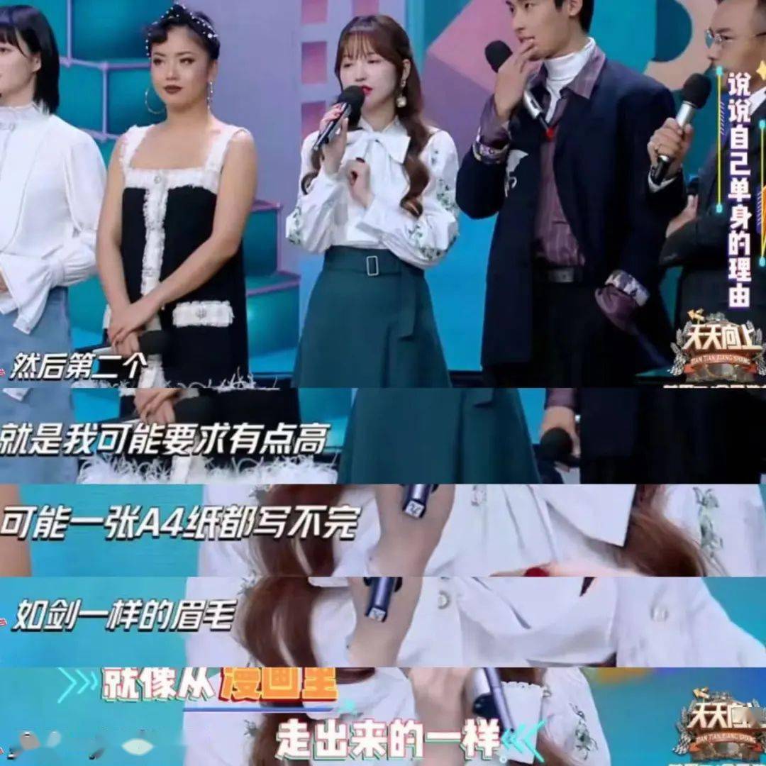 她在“浪姐”里谈自己的理想型,从五官到性格等方面都有自己的取向,要有逻辑感、阳光、笑起来灿烂、鼻子高、眼睛能和她交流、年龄小.......