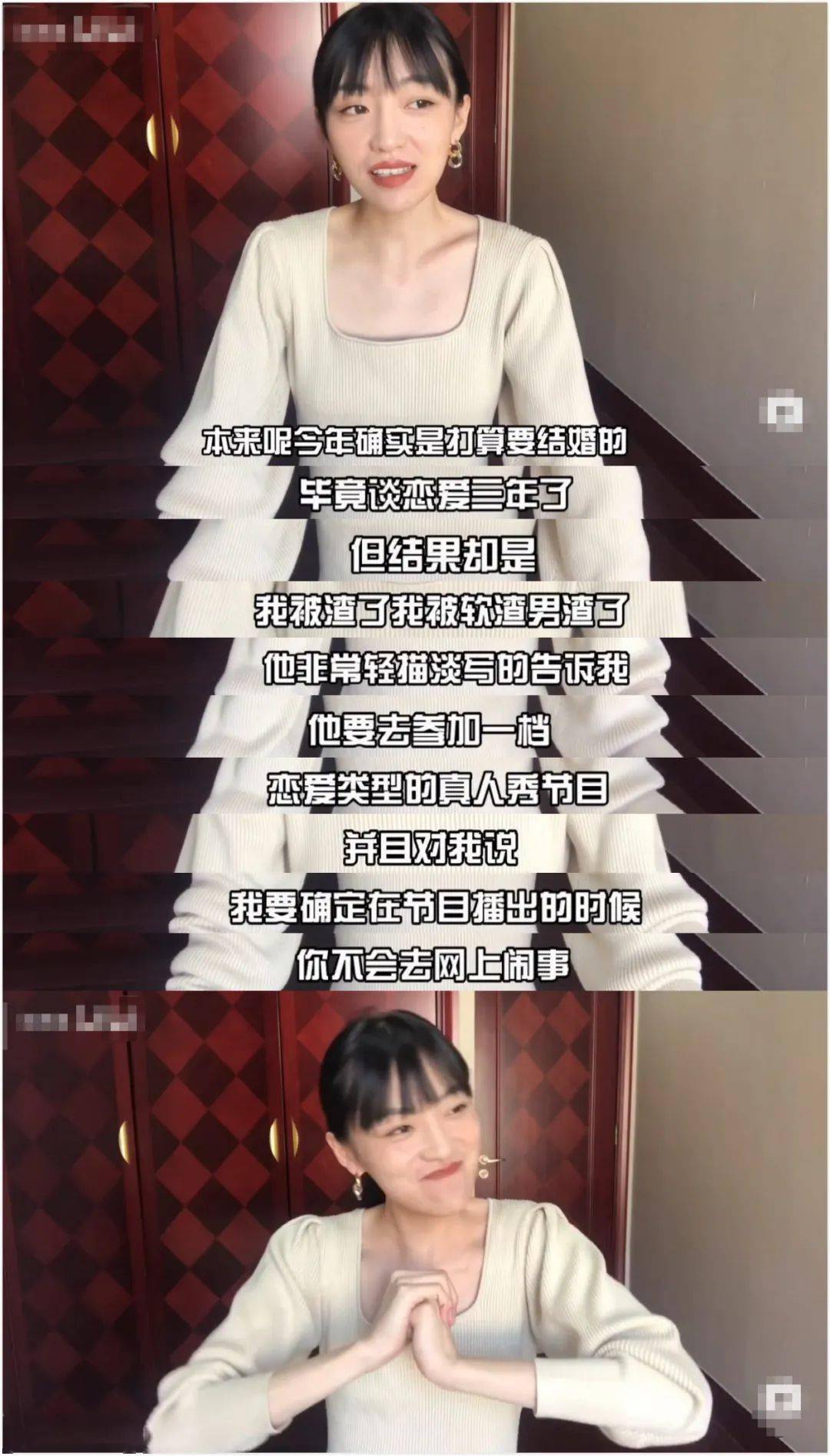 她表示自己本来已经要和恋爱三年的歌手男友结婚,但男友为了上一档恋爱真人秀,就用冷暴力逼她说了分手,还要求她不准在网上闹事。