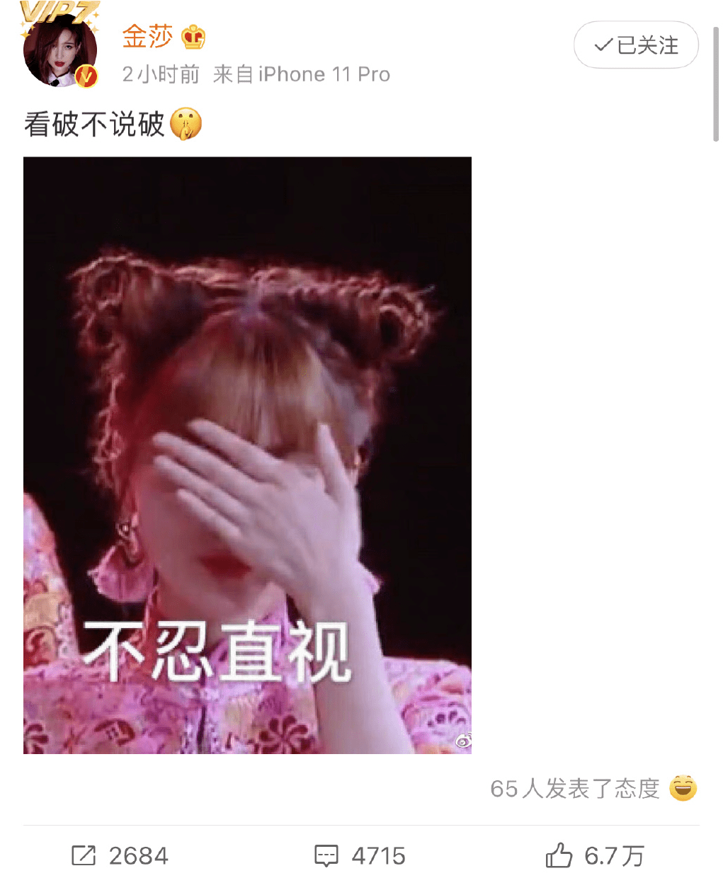 当时,金莎发了一条微博,“看破不说破”,还特意配上一张自己“不忍直视”的表情包。围观群众也很有默契,纷纷领会了她“不忍直视”暗指的对象,正是耿斯汉。