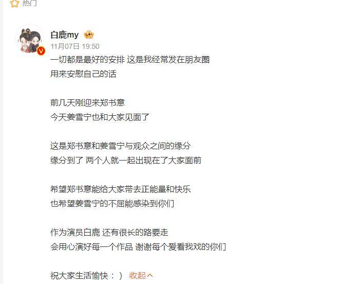 搜狐娱乐讯 11月7日,演员白鹿发文回应两部剧同时播出,她写道:“这是郑书意和姜雪宁与观众之间的缘分,缘分到了,两个人就一起出现在了大家面前。”