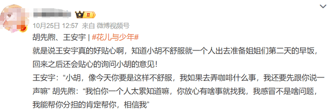 后来两人还因为“早上要不要叫对方起来买早餐”的问题展开了讨论,王安宇主动问胡先煦以后像这种问题要不要叫他,胡先煦明确表示“我怕你一个人太累知道嘛,你放心有啥事就找我,我感冒不是啥问题,我能帮你分担的肯定帮你,相信我”,这次“早餐事件”才算圆满完结。