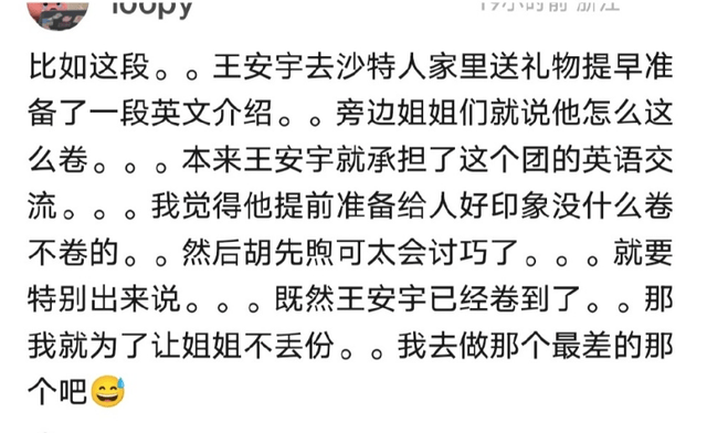 花少团为主人家准备了礼物,王安宇提前为自己的礼物写了一段英文介绍,想要向外国友人输出中国文化,其他人都没准备,王安宇因此被称为”卷王“,这还没完。王安宇结束介绍之后,大家因为都没有准备介绍词而不敢上前,这时候胡先煦出来破冰,简单介绍了一下自己的礼物,为姐姐们缓解尴尬的场面。
