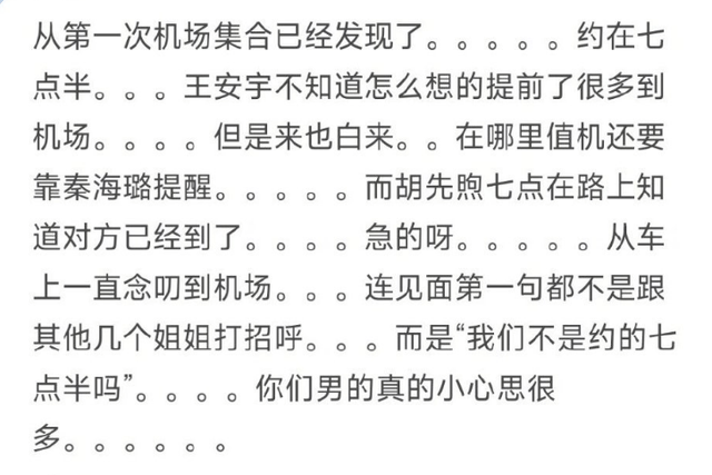 首先就是最开始的时候,节目组定下了胡先煦和王安宇作为导游,带着姐姐们玩。在机场集合时间上就闹出矛盾,大家都商量好七点半集合,但是王安宇提前到了机场,而胡先煦则按照定好的时间出发,这两人的做法其实都没什么问题,一个怕有什么突发状态所以提早出发,一个按照约定遵守时间。