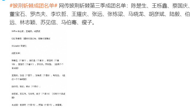 11月5日,最新一季《披荆斩棘》迎来成团夜。伴随最后一次公演结束,成团名单也开始被现场观众曝光。据悉,本季《披荆斩棘》共有17位哥哥成团,包括陈楚生、王栎鑫、蔡国庆、陆毅、林志颖等。