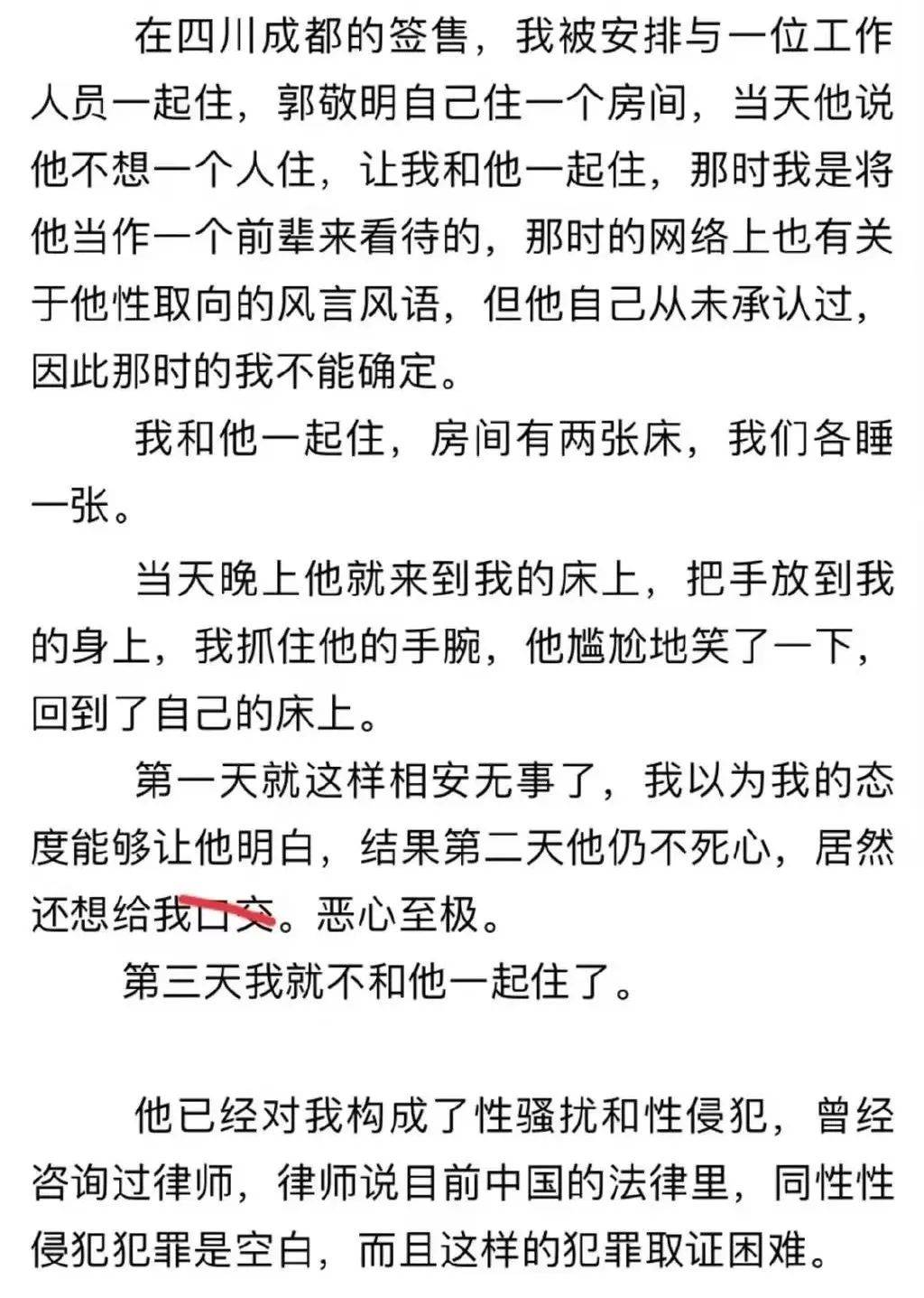 因此,李枫第二天就没和郭敬明同住了,他将这件事准确地定义为性骚扰,这也对他造成了极大的心理阴影。