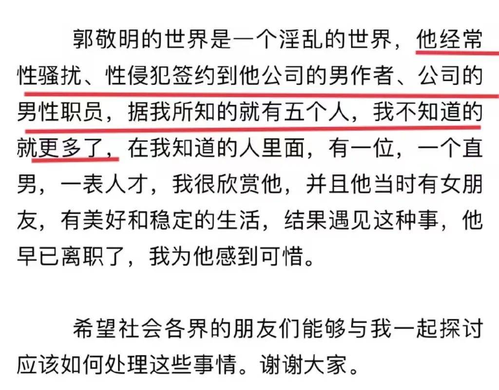 李枫还称郭敬明的“黑手”不止伸向了他,公司里的男作者、男性职员都受到过骚扰,更严重的已经被侵犯了,李枫称自己所知道的就有五个人。