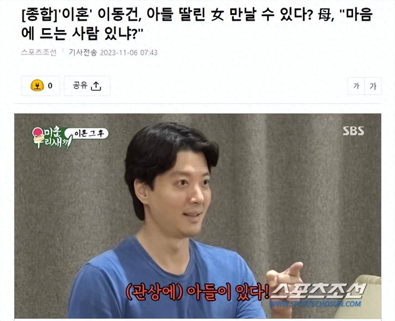 11月6日,有韩国媒体报道,在5日播出的SBS综艺节目《我家的熊孩子》中,作为新嘉宾加入节目的演员李东健坦诚地讲述了自己的感情生活。