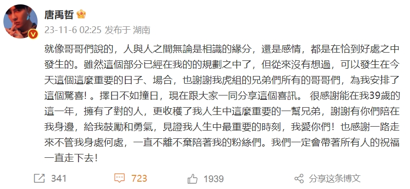 唐禹哲写道:“就像哥哥们说的那样,人与人之间无论是相识的缘分,还是感情,都是在恰到好处之中发生的。虽然这个部分已经在我的规划之中了,但从来没有想过,可以发生在今天这个这么重要的日子、场合,也谢谢我虎组所有的哥哥们为我安排了这个惊喜!择日不如撞日,现在跟大家一同分享这个喜讯。很感谢能在我39岁的这一年,拥有了对的人,更收获了我人生中这么重要的一帮兄弟,谢谢有你们陪在我身边,给我鼓励和勇气,见证我人生中最重要的时刻,我爱你们!也感谢一路走来不管我身处何处,一直不离不弃陪着我的粉丝们。我们一定会带着所有人的祝福一直走下去!”