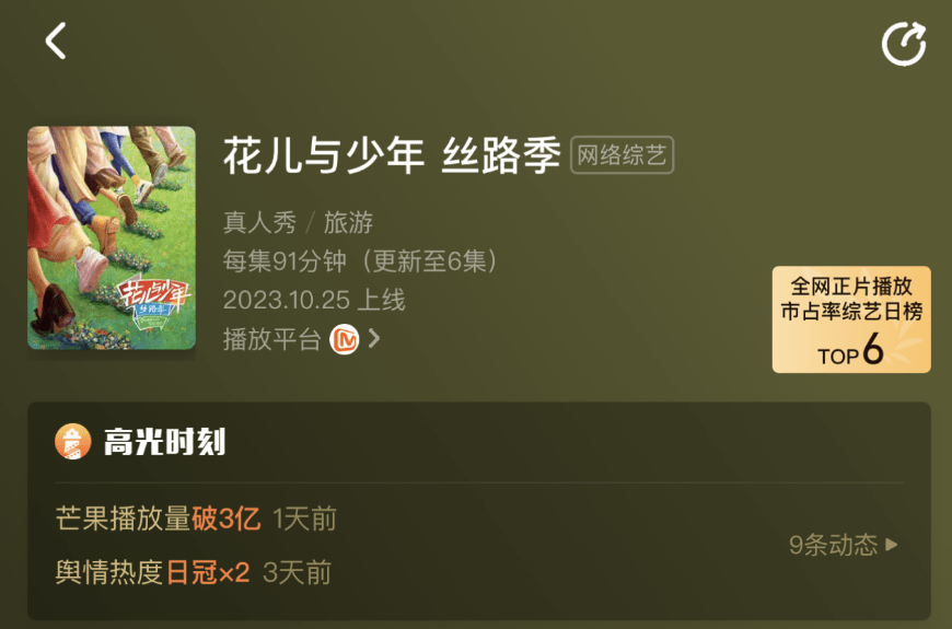 10月26日,芒果新综艺《花儿与少年·丝路季》开播,刚开播三天的热搜,就比其他节目一个月都多。