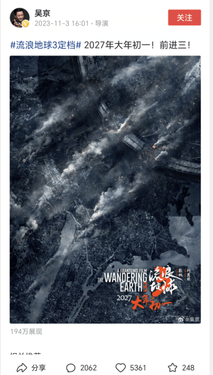就在大家还在对此进行激烈的辩论的时候,吴京冷不丁的发了一条动态:“2027年大年初一,流浪地球3定档”。