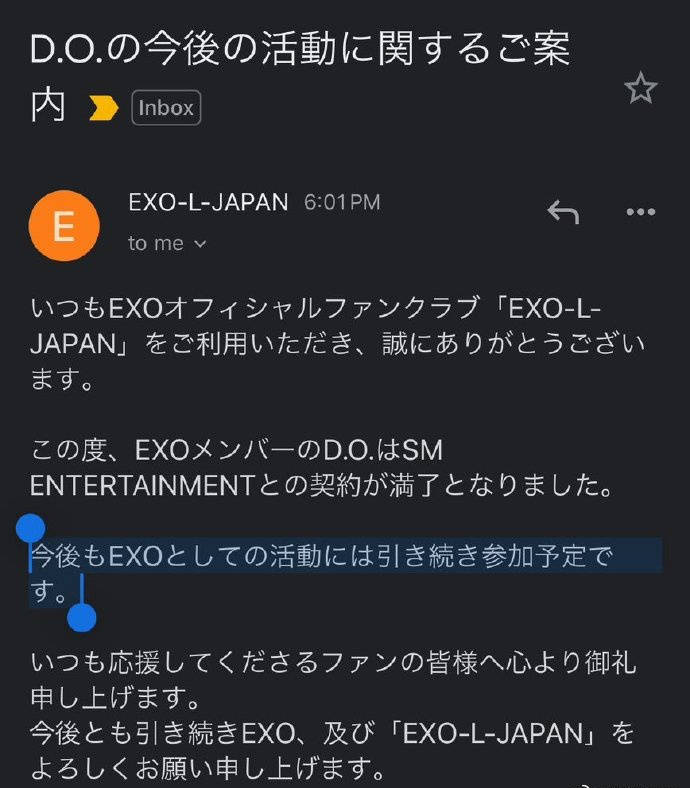 搜狐娱乐讯 11月2日,EXO-L-JAPAN官咖向粉丝发送邮件,宣布EXO成员D.O.都暻秀与SM ENTERTAINMENT的合约到期,真心感谢一直给予支持的粉丝们,但都暻秀仍会以成员身份继续参与EXO活动。此前,都暻秀与南景秀共同设立新公司"Soosoo",公司名称取自二人名字。
