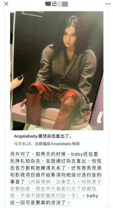 11月1日,有知名娱记爆料,杨颖的复出计划也陷入了困境。之前,她试图通过杂志复出,但是遭遇了各方的抵制。据悉,一些商务资源和影视项目组甚至开始筹谋向她追讨违约金,使得她的复出前景更加不明朗。