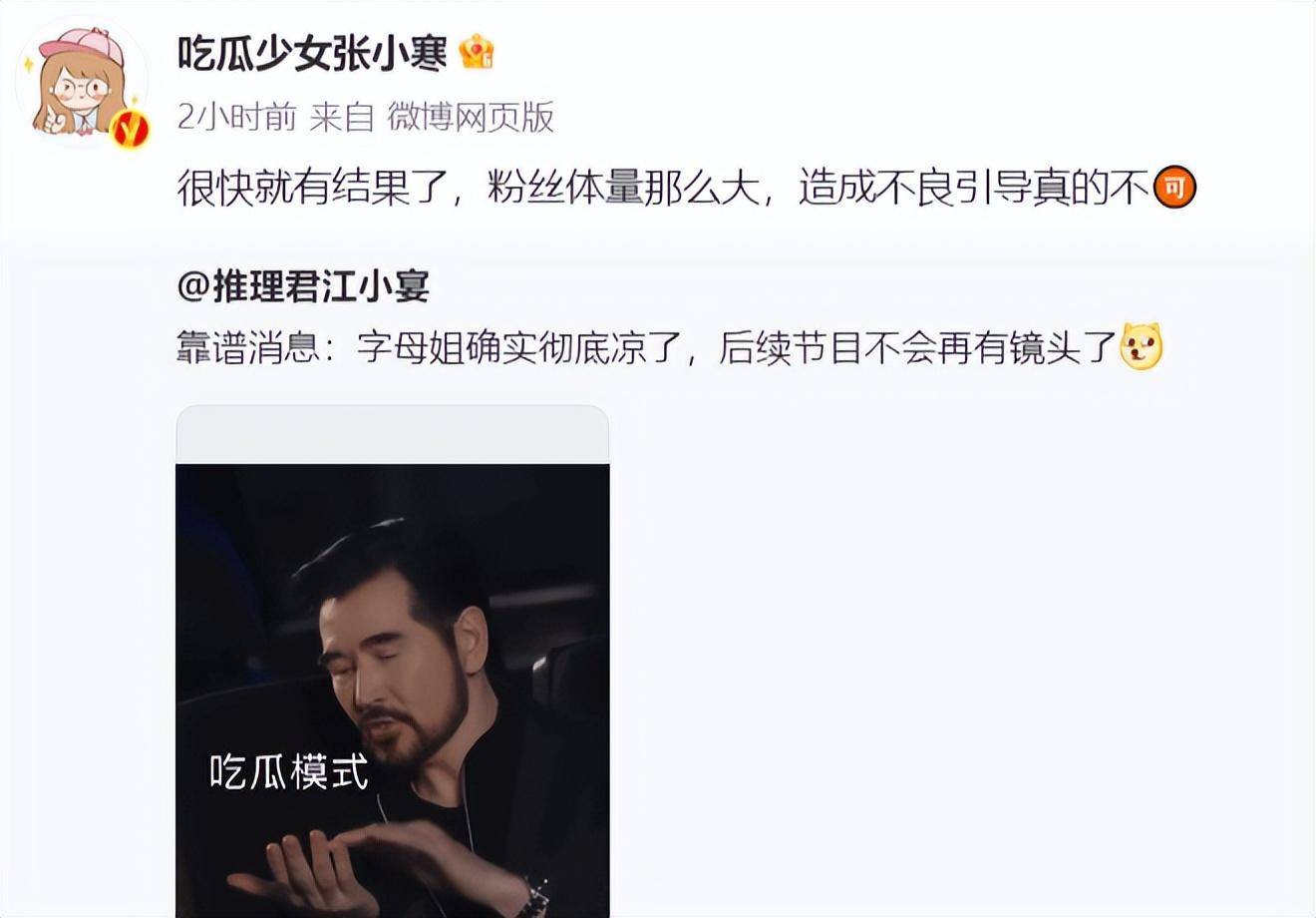 另一娱记江小宴也在多日前表示,收到靠谱消息,字母姐确实彻底凉了,后续节目不会再有镜头了。