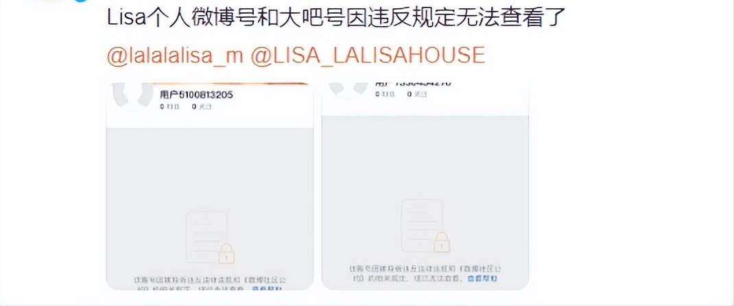 11月1日,有网友发现,此前因出演疯马秀的Lisa账号被封了,连同Lisa大吧的微博账号都被炸号了,这一消息出来后,瞬间引起粉丝的不淡定了,看来这是要整顿了。