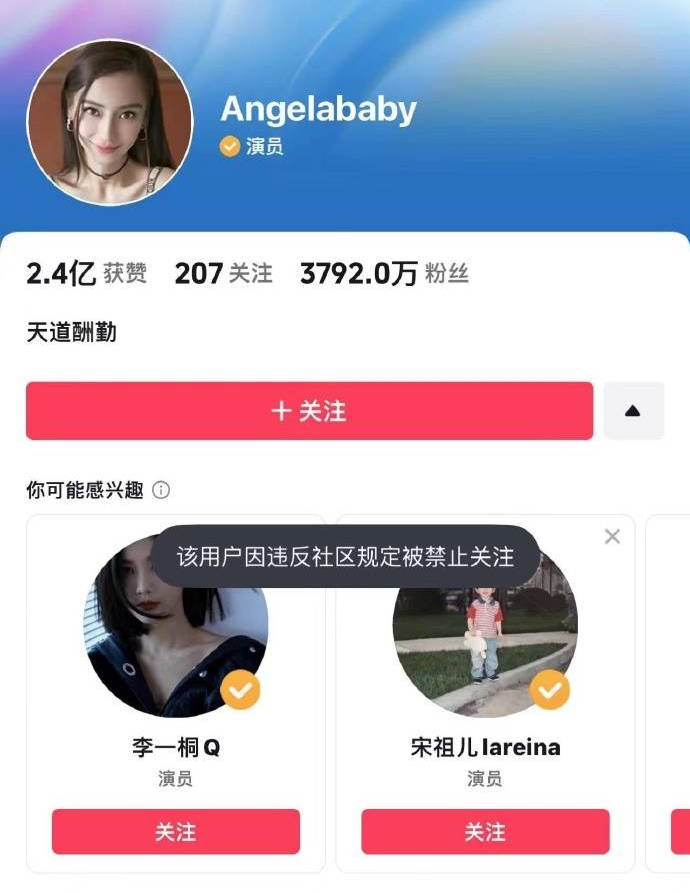 搜狐娱乐讯 11月1日,有网友发现Angelababy和张嘉倪的抖音账号出现异常,目前是无法被关注的状态,疑似是受疯马秀风波影响。此外,Lisa的个人微博账号和另一个相关账号也已显示无法查看。