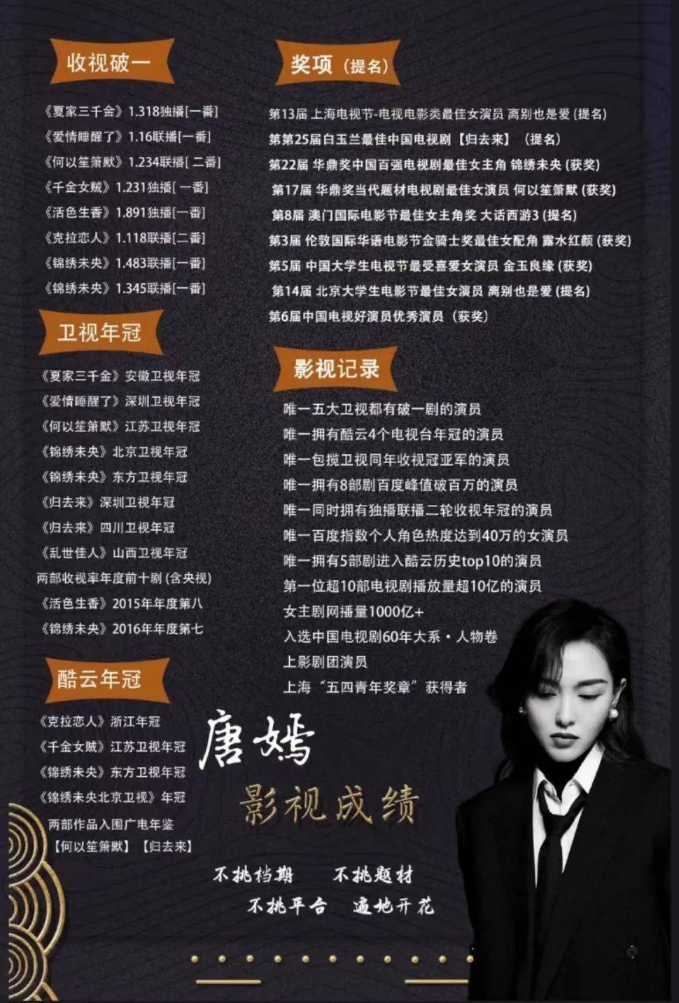 后来,唐嫣又出演了《夏家三千金》《活色生香》《何以笙箫默》《锦绣未央》等多部爆款作品,拿下了许多收视冠军,实绩非常能打。