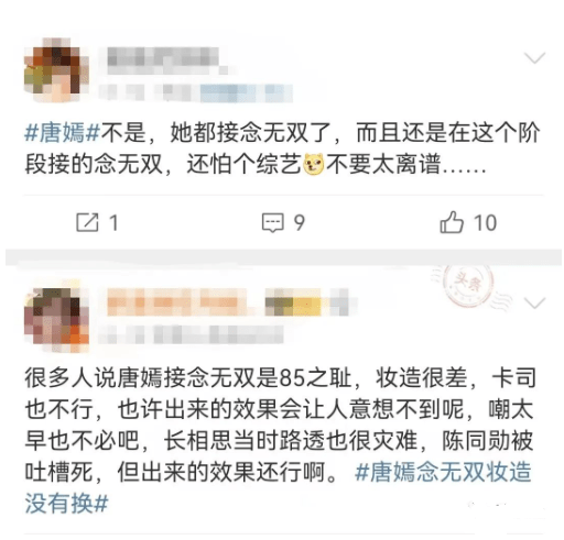 而且唐嫣参加的是屡屡出事的蓝台综艺,近几年网友们对蓝台的意见都很大,也不知道她是怎么想的。