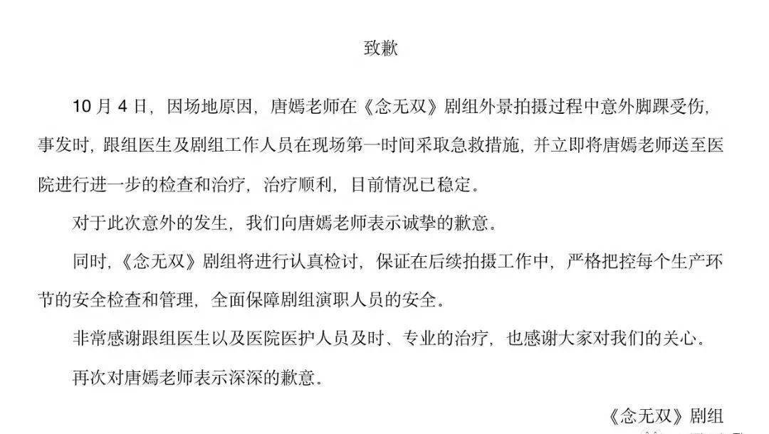 而且,在《念无双》剧组拍摄时期,唐嫣还意外脚踝受伤,所幸顺利治疗无大碍,剧组也及时向外界发出致歉通知。