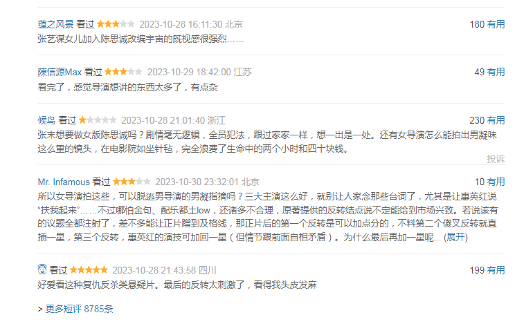而打一星差评的观众很愤怒,他写道“张末想要做女版陈思诚吗?剧情毫无逻辑,全员犯法,跟过家家一样,想一出是一出。还有女导演怎么能拍出男凝味这么重的镜头,在电影院如坐针毡,完全浪费了声明中的两个小时和四十块钱。”此外,还有观众评价电影是“低配《满江红》”等。