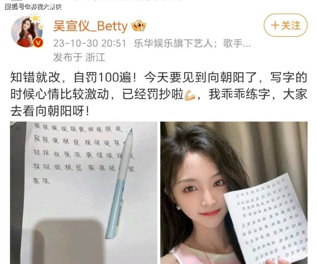 不久,吴宣仪发文表示写字的时候心情太激动了,已经知错就改,自罚100遍,并晒出自己写“根”的照片。不错,态度很端正嘛。
