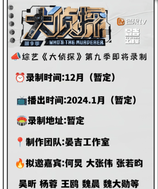 眼看着十月进入尾声,由芒果台独家打造的《明星大侦探》第九季也如约而至,进入到了招商、录制筹备阶段。按照网友的爆料,《明侦9》将于12月展开录制,最迟1月底便会上线与观众见面,相比前几季录制时间和上线时间都有所推迟,但好饭不怕玩,高质量的节目值得等待。