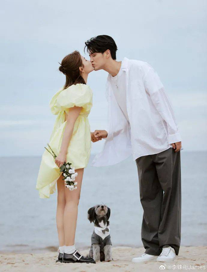 李铢衔穿着白色衬衫和黑色裤子,同一袭黄色短裙的马嘉莹深情一吻,周边小狗仰头观望,真是公然虐狗啊!