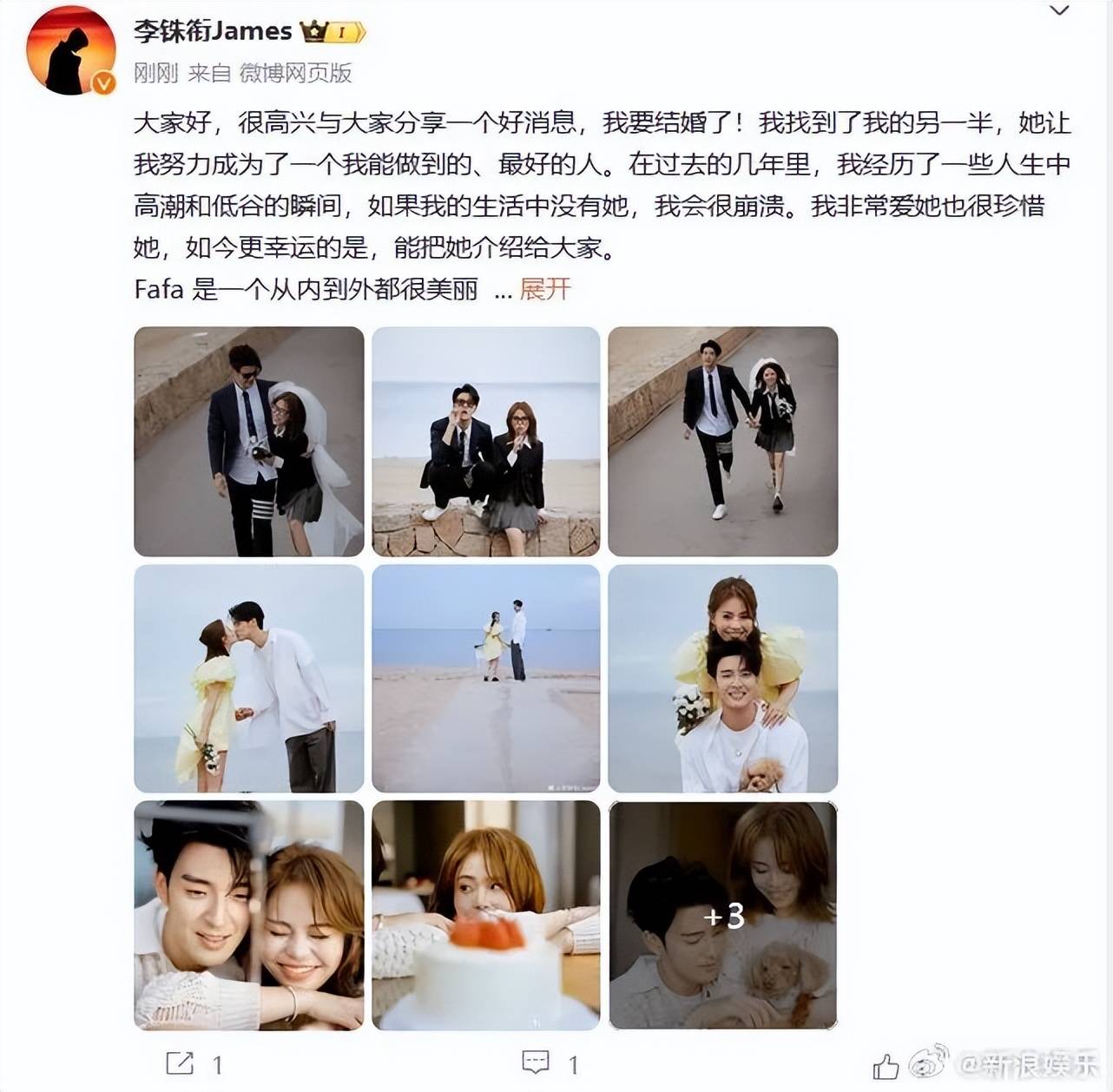 30日,曾参加《披荆斩棘的哥哥》的李铢衔晒婚纱照官宣和女友结婚,他微博写道:“我要结婚了!我非常爱她。”