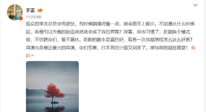 搜狐娱乐讯 29日,于正发文回复新剧妆造遭到网友吐槽,于正写道:“观众的审美总是变得很快,有时候剧播得慢一点,就会跟不上脚步。不知道从什么时候起,我最引以为傲的妆造突然就变成了我的原罪?没事,我也习惯了,新剧换个模式做,不惊艳你们,誓不罢休。新剧的剧本是真的好,每看一次我都感叹怎么这么好看?导演也是最近最火的导演,你们等着,打不死的小强又回来了。期待我的视觉盛宴!”