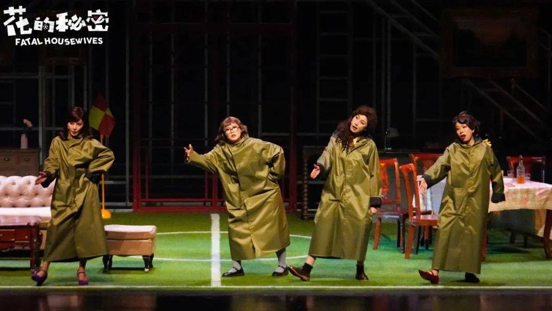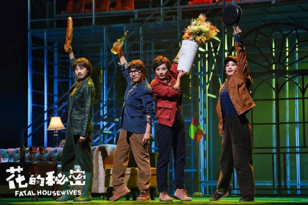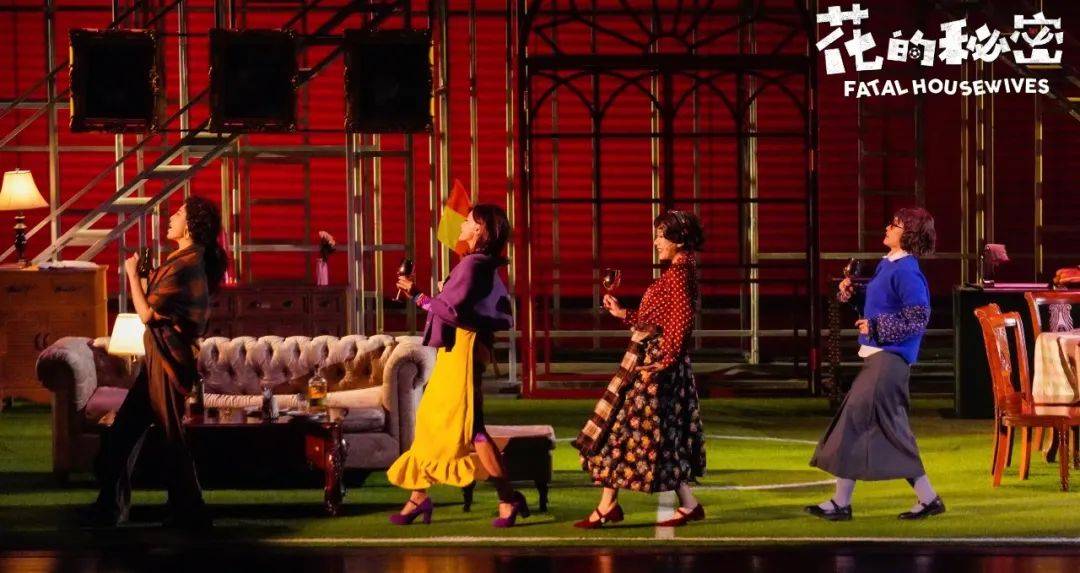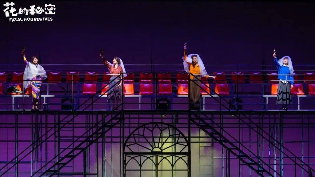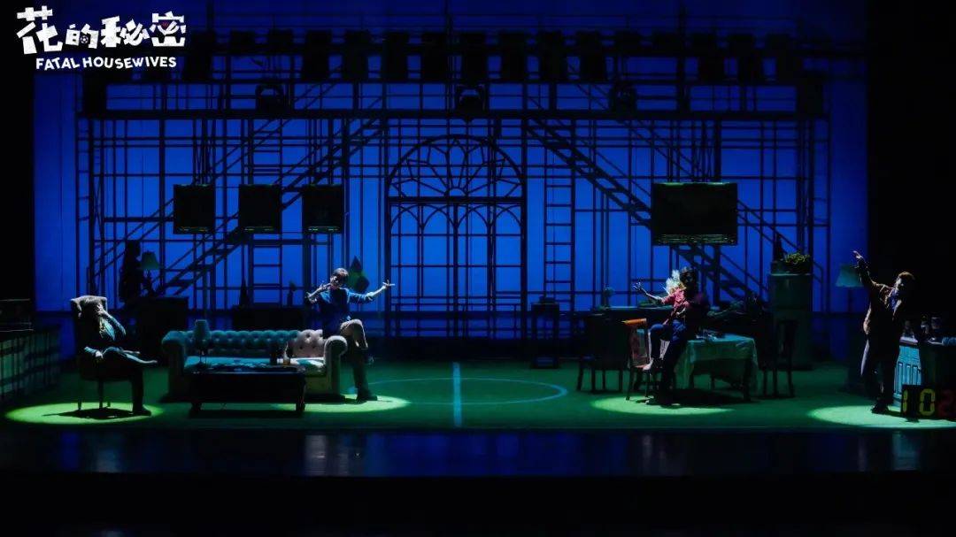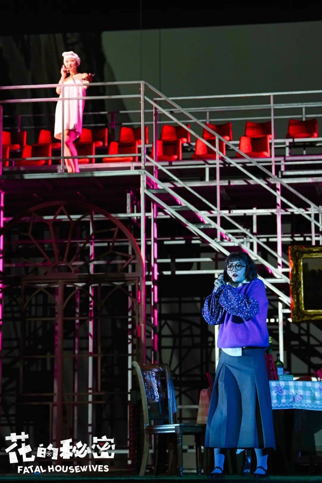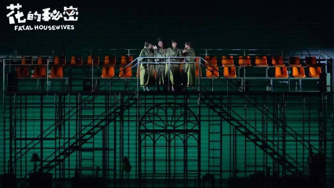 《花的秘密》的舞美设计以镂空装置为主体进行分区置景,既是室内室外的“房门”外化,也是女人们与丈夫之间的屏障。同时这种可攀登的设计也增加了剧目的几何维度。同时镂空的设计既讲舞台屏幕展示在观众面前,也在视觉上恰到好处的前后台区分。灯光和舞台节奏相互配合的设计,完好的诠释了角色间的情感分野和心理提防,每一次灯光笔触的变化都能表达出人物当时的情感走向。利用剧本提供的戏剧矛盾和场景转换,每个角色的特点特色都被冠以始终,既保证了完整性也达到了幽默的效果。