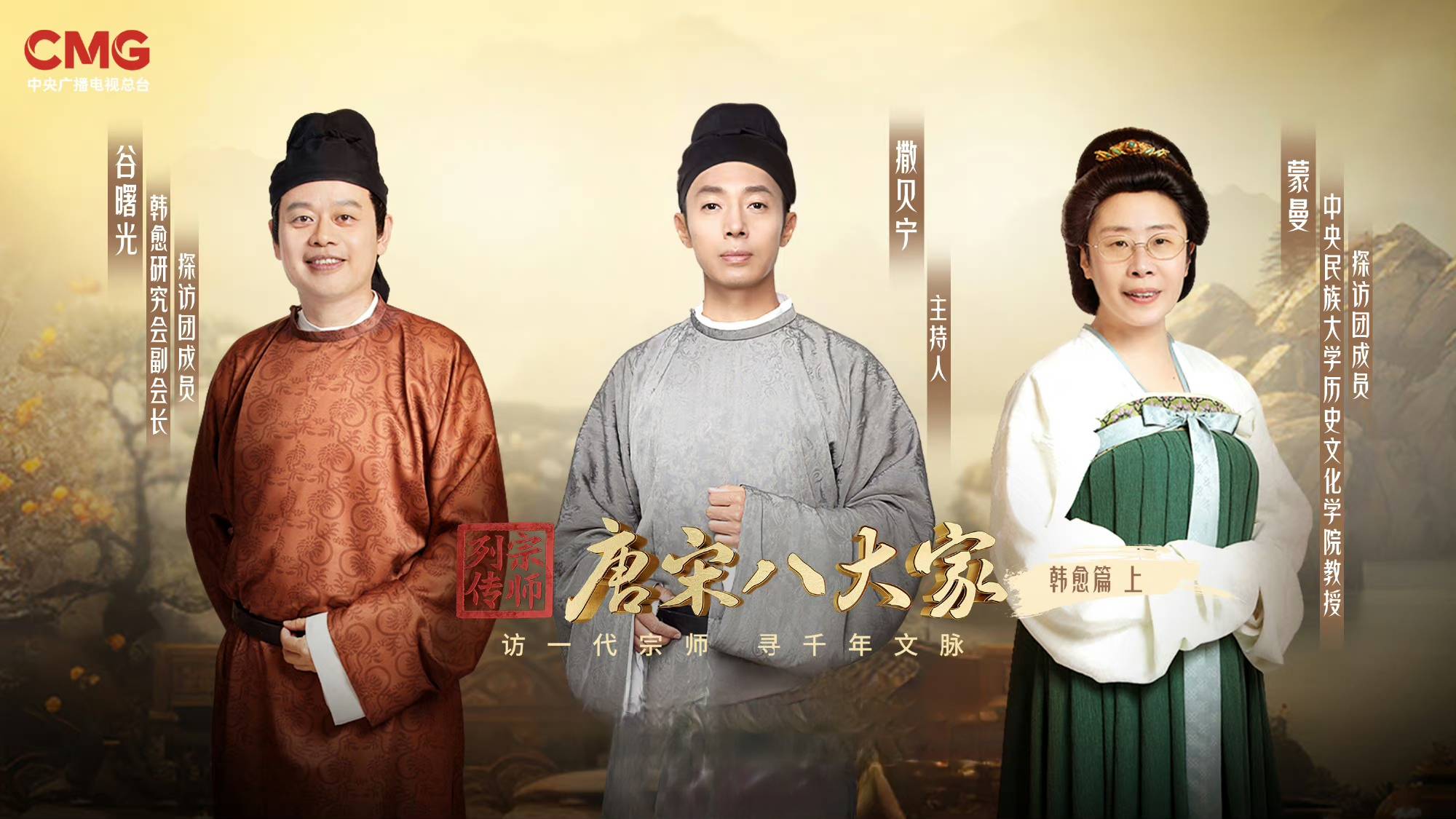 《唐宋八大家》就是把每一位大家单独拎出来做一期节目,演员、主持人、专业学者一起穿越时空,沿着唐宋八大家的人生轨迹,探寻他们从一介草民成长为一代宗师的不平凡历程。首期节目的主角是韩愈,由撒贝宁、中央民族大学历史文化学院教授蒙曼、韩愈研究会副会长、教授谷曙光组成探访团,回到大唐,追寻文学大师韩愈的文人风骨。