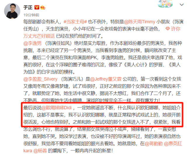 当时,关于她凭姐姐的人脉得到演出机会的消息不绝于耳,制片人于正亲自发文予以澄清。