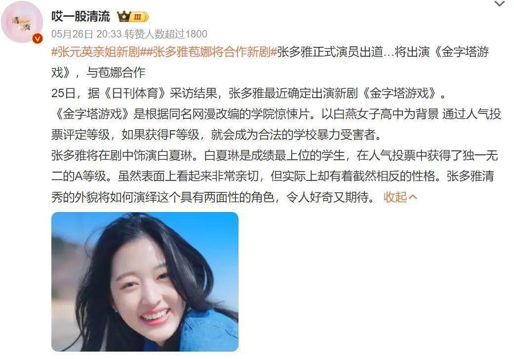 今年五月确定将出演漫改电视剧《金字塔游戏》(女二位置),正式以演员的身份出道。