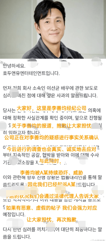 而今天李善均的经纪公司发出声明承认了这件事,表示抱歉让大家担忧了,目前李善均涉毒事件正在调查中,今后也会诚实地去面对。同时,其经纪公司还提到了一个令人惊恐的点,称李善均被A某恐吓威胁了,由于持续遭受诽谤和威胁,李善均方已经起诉了A某。