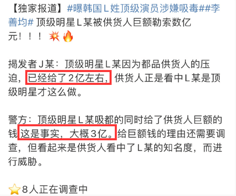 据透露,这位A某是李善均的供货人,正是看中了李善均的知名度而勒索三个亿,此前李善均顶着A某的压迫,已经给了2亿,但A某还是继续对其进行威胁勒索。不仅如此,网上还曝出连同李善均一共有八位演员、练习生等都涉毒。