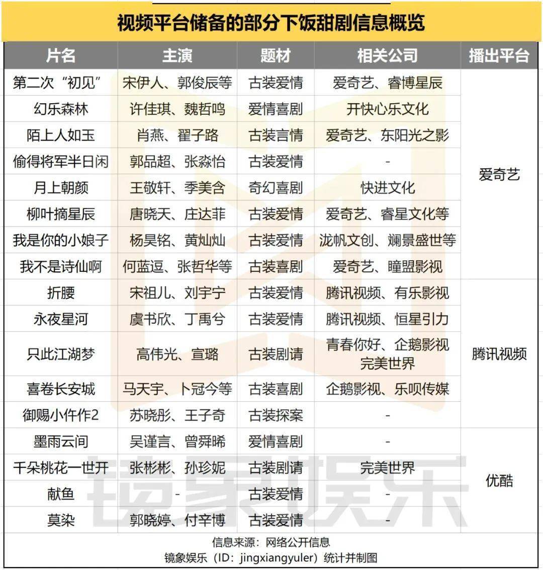 在这样的发展趋势下,各平台也乐于在此类内容上加码投入。从各家片单的储备内容来看,爱奇艺的《我不是诗仙啊》走喜剧路线,剧中的穿越元素和对普通人的聚焦延续了下饭剧的创作走向;《第二次“初见”》《幻乐森林》《陌上人如玉》《我是你的小娘子》等多部剧集也都容纳了轻喜剧的氛围和甜爱元素。