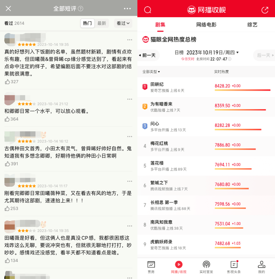 当然,《田耕纪》能够拿到不俗的热度表现,除了口碑支撑外,还在于消费市场越来越需要“电子榨菜”。尤其是在当下,打工人最期待的休闲时光,莫过于在吃饭的时候打开一部剧来下饭。