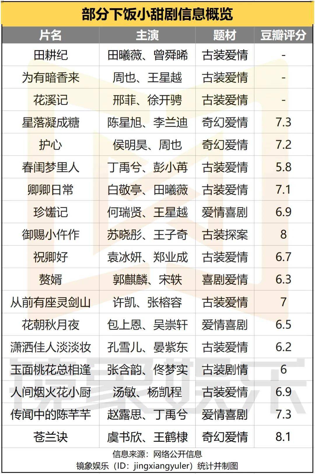 无独有偶,近年来,此类下饭剧层出不穷,从早一些的《人间烟火花小厨》《传闻中的陈芊芊》,到后来的《卿卿日常》《护心》《星落凝成糖》等,轻喜剧的框架下,这类体量更轻、观感也更轻松的小甜剧不断走出一个个高光时刻。