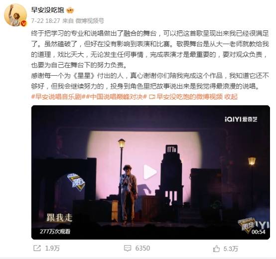 今年在《中国说唱巅峰对决2023》中成功卫冕说唱三冠王的早安,专注于说唱音乐创作演唱的同时,也让大家见识了他在影视戏剧表演和播音主持领域的天赋。其中,歌曲《星星》独辟蹊径,以音乐剧的形式诠释作品爱与和平的反战内核,极具创新性的歌曲编排以及全身心的投入演绎感动全场。