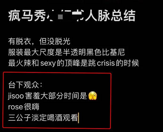原标题:Lisa疯马秀表演被嘲太干瘦:智秀捂眼,彩英很嗨,三公子淡定喝酒