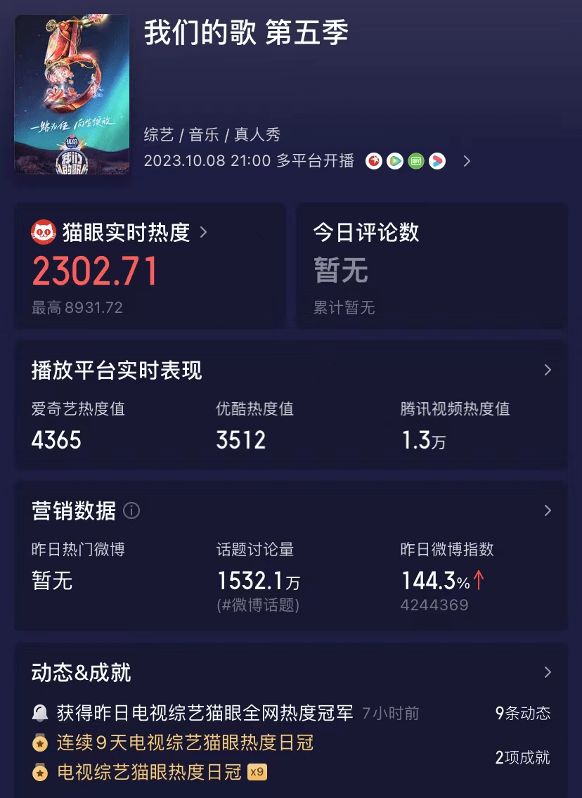 这档音乐综艺节目已经连续四季的大获成功,观众喜爱程度和收视率一直居高不下。上线仅10天以来连续9天是热度冠军,可谓是收视口碑齐飞。以数据和广泛传播的好口碑来看,可以毫不夸张地说,《我们的歌》第五季继续闪耀,以全新姿态再度震撼观众,以"音乐绽放再次"来形容实在再合适不过。