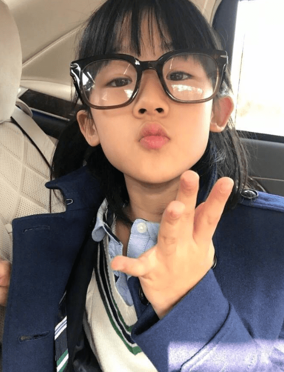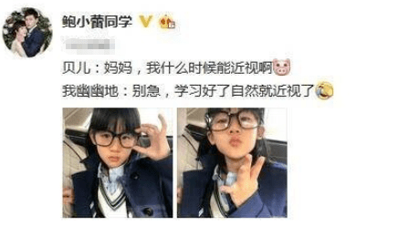 贝儿也很喜欢自己戴眼镜的样子,早些年鲍蕾曾晒出贝儿戴眼镜拍摄的萌照并附上一段母女对话,对话中贝儿就问妈妈自己什么时候能近视。