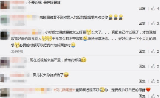 对于喜欢戴眼镜想变成近视眼的贝儿,当时还有不少网友留言相劝,其中,有网友就拿自己当反面教材劝贝儿:“小时候觉得戴眼镜文艺好看,长大了真把自己作近视了,才发现戴眼镜好看的那是别人。”