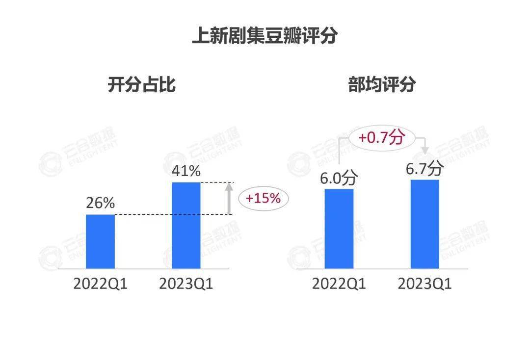 第三方的统计数据也支持这一结论。根据云合数据统计,2022年Q1上新剧集的部均豆瓣评分是6.0,而2023年同期的部均评分则上涨到了6.7,涨幅非常明显。
