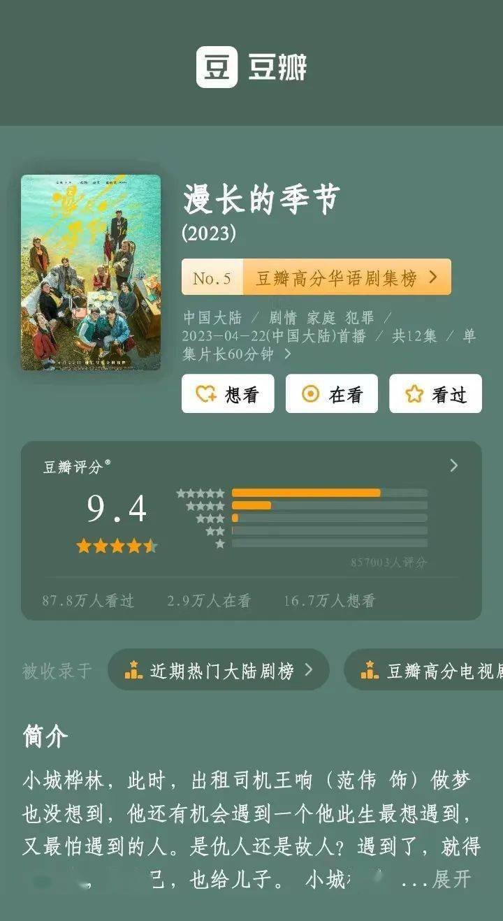 根据统计,今年21部豆瓣评分破8国产剧如下,其中口碑榜首为腾讯视频“X剧场”《漫长的季节》,85.6万人评分9.4,堪称年度“剧王”。