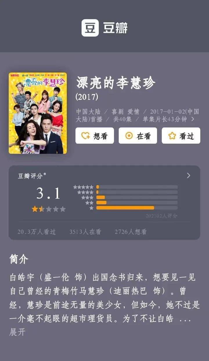 2018年金鹰奖颁奖前后,大量用户对《漂亮的李慧珍》进行低分评价,造成短时间这部作品的评分从4.6降至3.5,呈现出一种“L”型分布。