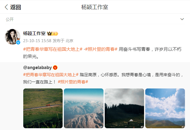 10月15日,在时隔了半个月之后,Angelababy也终于更新了动态,这也是她在风波之后首次“发声”,她在个人的社交平台上分享了一组风景美照,并为此配文:“踏足高原,心怀感恩。我想青春是心境,是用来奋斗的,我们一直在路上!”随后,杨颖工作室也转发宣传:“用奋斗书写青春,许岁月以不朽的荣光。”这也受到了网友们的广泛关注。