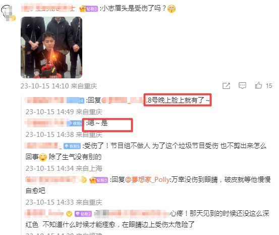 此外,还有网友关注到林志颖鼻根处已经结痂的深色伤口,留言询问:“小志眉头受伤了吗”?很快有铁粉回应称的确是受伤了,还说8号晚上脸上就有了,应该是五公录制时受的伤,或者是五公后那天在农场录制受的伤。目前,节目还没有播出,不知道播出时节目组会不会对林志颖受伤一事进行说明呢?