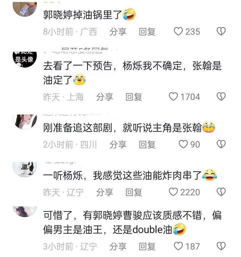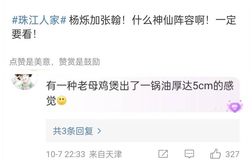 《珠江人家》宣布定档时,有人感慨“杨烁加张翰!什么神仙阵容啊”时,评论区一条核心“好油”的回复,成为前排高赞回复。