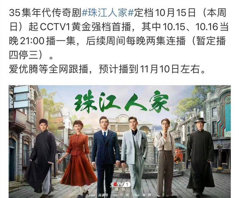 由吴斌执导的传奇年代剧《珠江人家》,接档《大道薪火》与观众见面。同时,还将通过3大视频平台全网跟播。