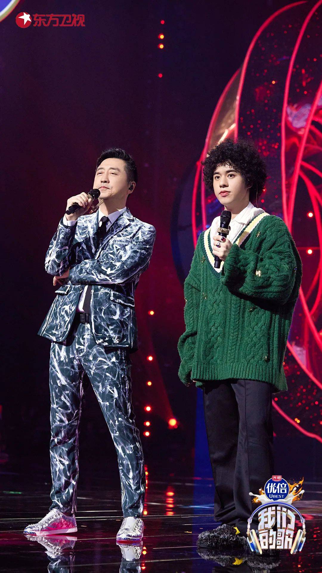 在变幻的舞台灯光和两人的嘶吼中,现场简直嗨到不行。曾比特坦言,庾澄庆是一个对音乐有高要求的人,这让他在彩排中压力不小,也希望可以呈现出最完美的合唱舞台。好在曾比特的表现赢得了庾澄庆的肯定,颇有些“严师出高徒”的意思。
